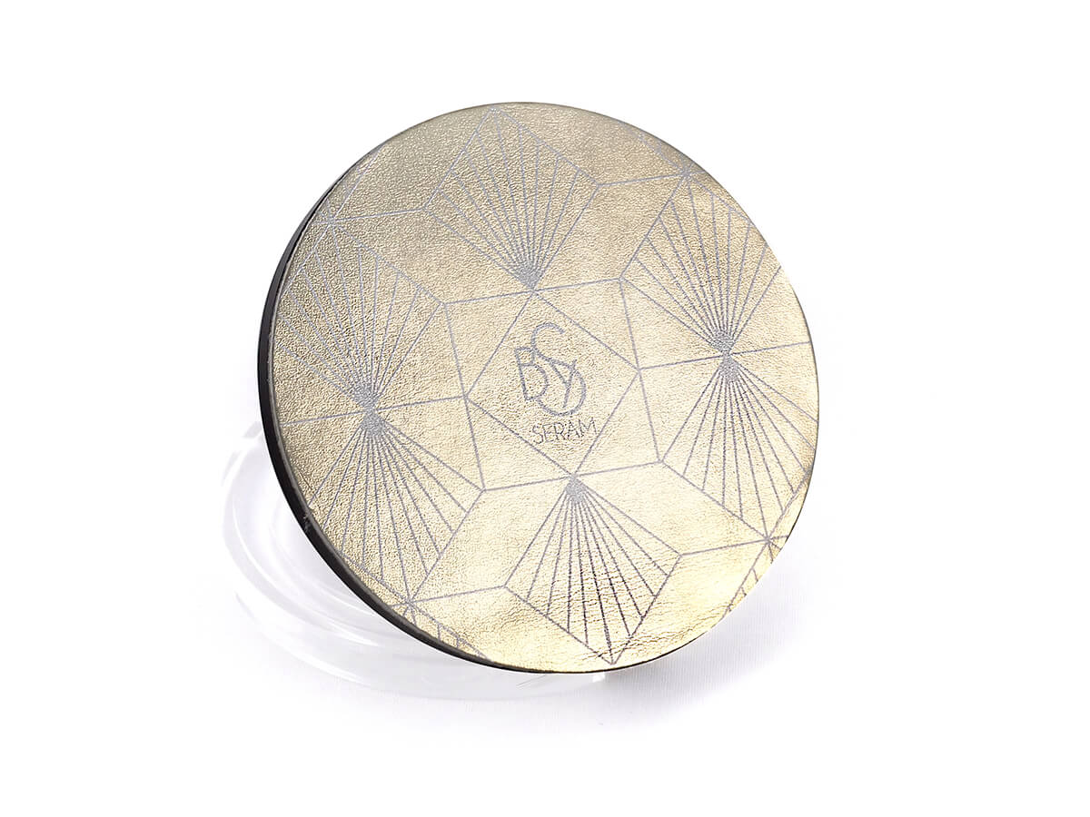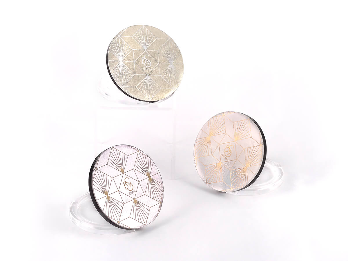 Son graphisme épuré se révèle grâce au procédé d’impression métallisée.
