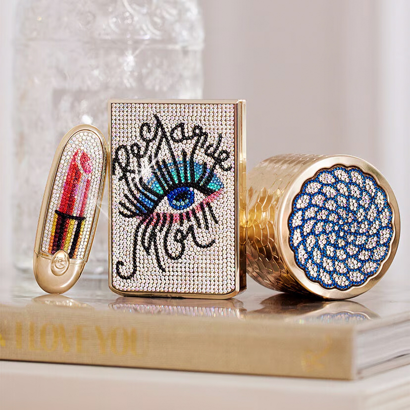 Les écrins bijoux « Rouge G Embrasse-moi ! » et « Ombres G Regarde-moi ! » sont recouverts de strass aux reflets holographiques et l’iconique rosace de l’écrin « Météorites Sous les étoiles », quant à elle, se présente dans une version strass, inspirée par la magie d’une nuit étoilée.