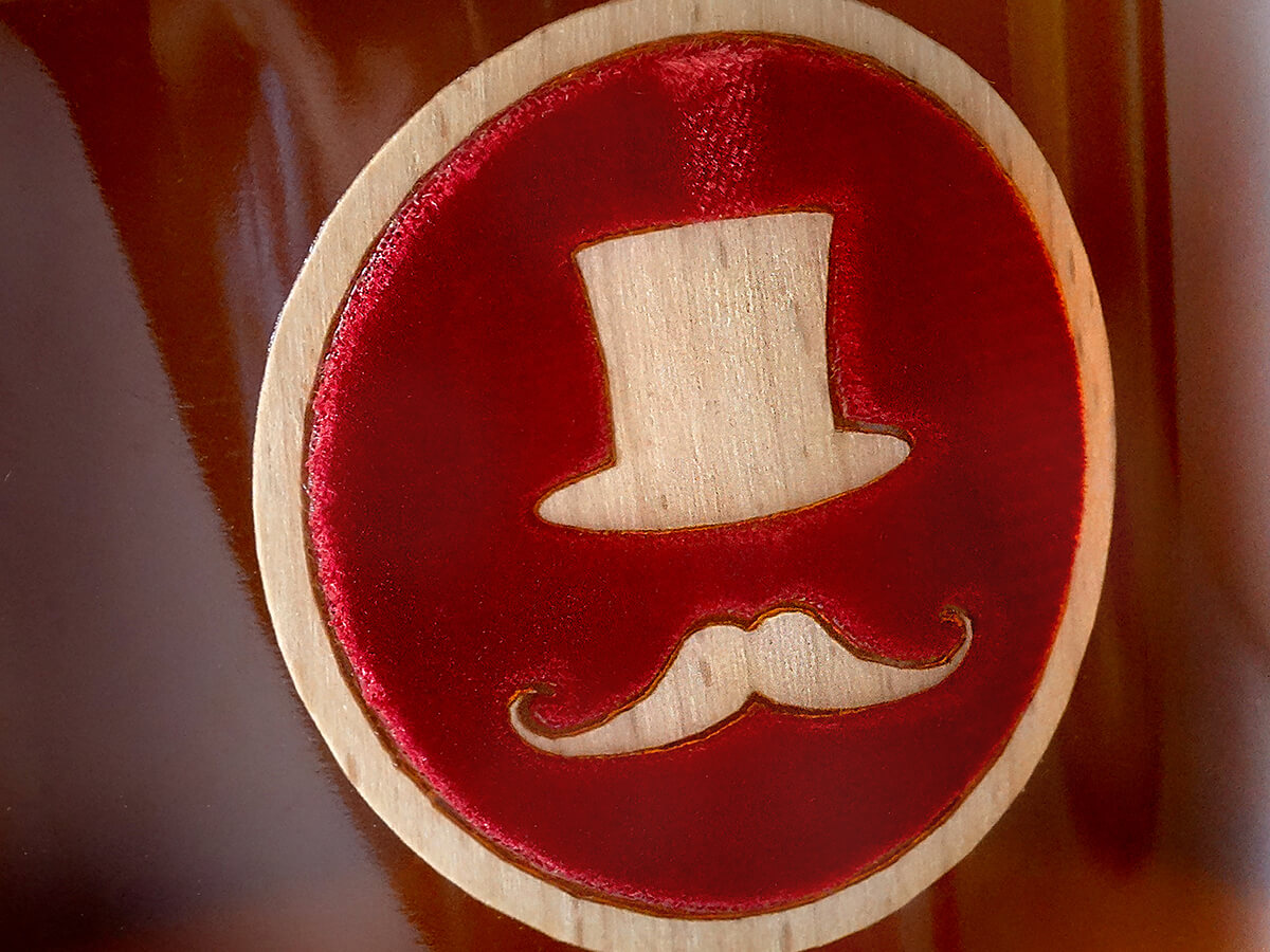 Affirmé, le sticker emprunte au cabaret le bois et le velours, dans une marqueterie subtilement composée.