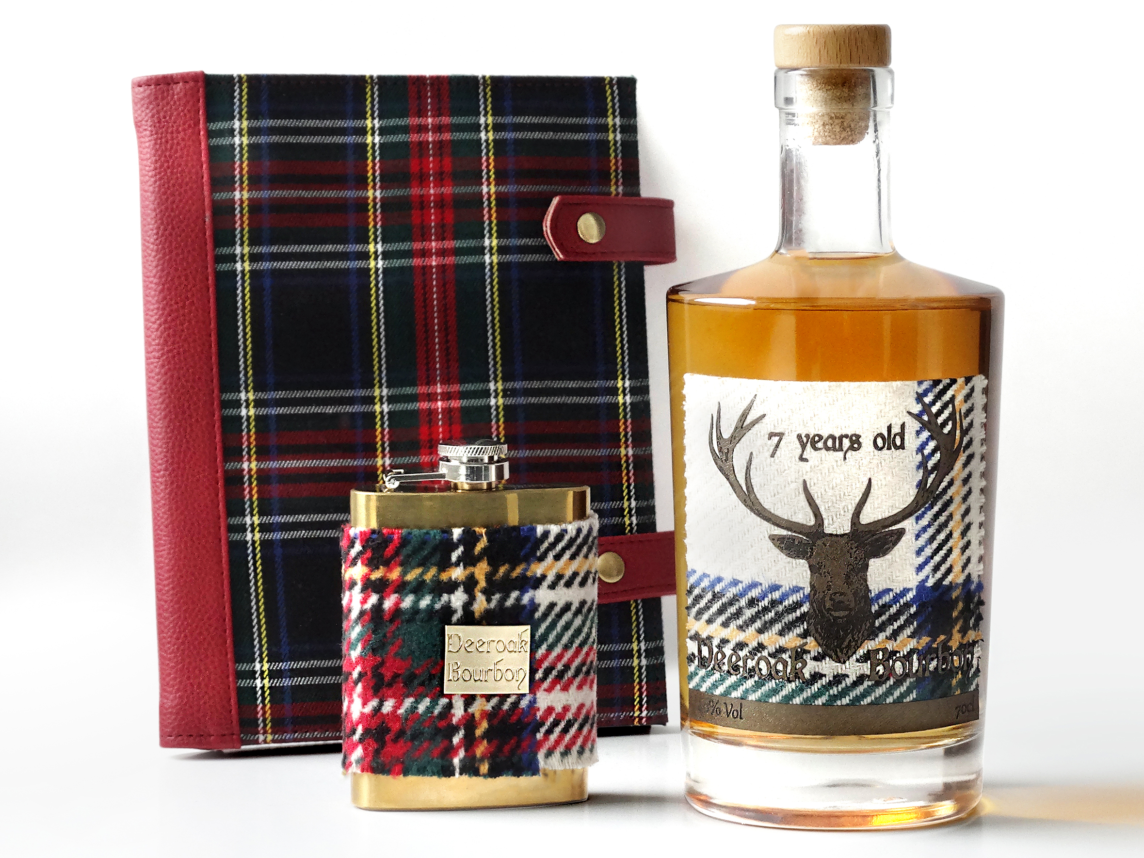 L’âme des Highlands émane de la collection WHISKY de SERAM. Habillée du tartan traditionnel, elle se décline en un col de bouteille et une flasque revêtue de son fourreau, tous deux en tweed écossais et respectivement ornés d’une plaque et d’une tête de cerf en zamac ton or. Tweed également pour le Notebook souligné d’un complexage de PU rouge effet poulain. Un sticker textile, découpé et gravé au laser, complète cet ensemble aux couleurs chaleureuses et familières.