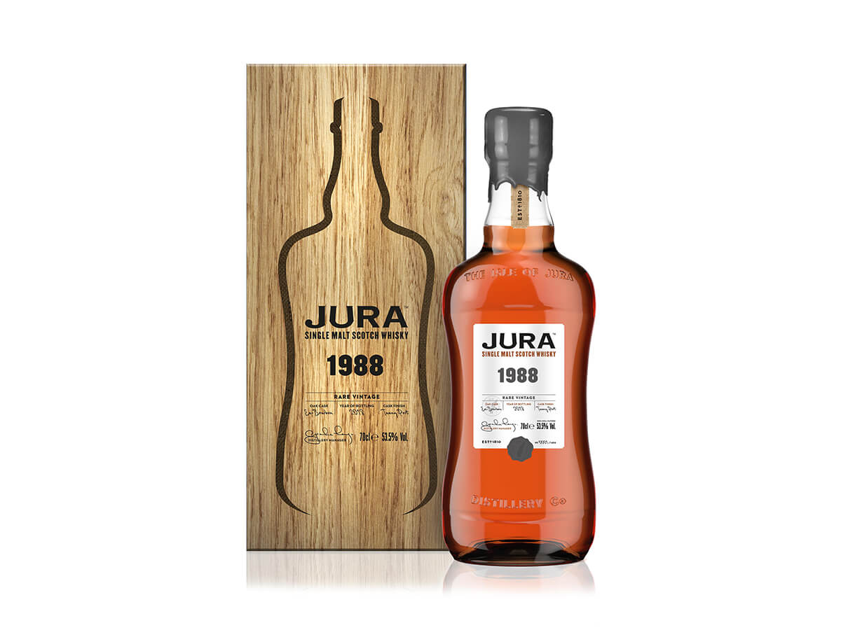 Jura lance une nouvelle gamme de single malts Prestige, issue de ses stocks de whiskies «anciens et rares», avec ce millésime 1988 affiné en fûts de Porto Tawny de 20 ans d’âge.