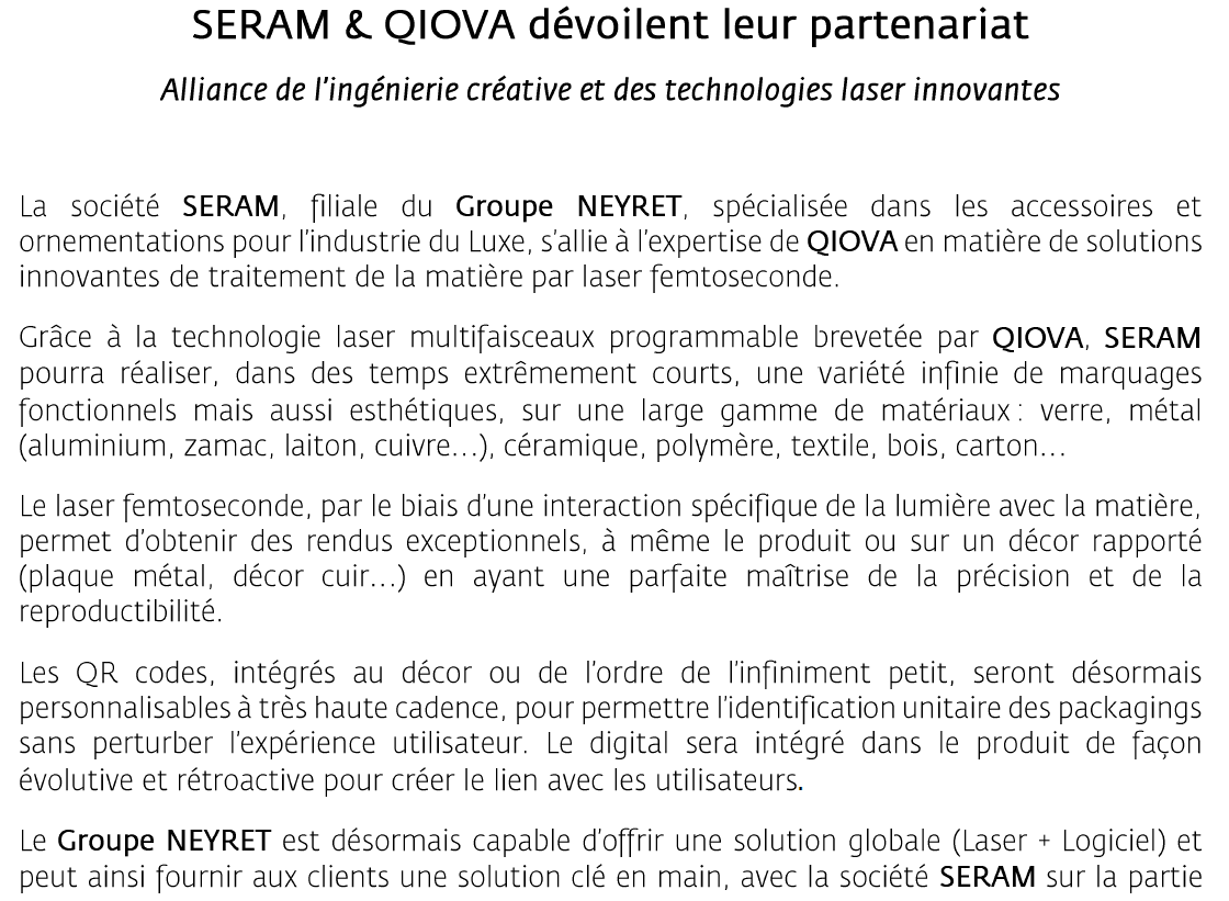 SERAM & QIOVA dévoilent leur partenariat, alliance de l’ingénierie créative et des technologies laser innovantes